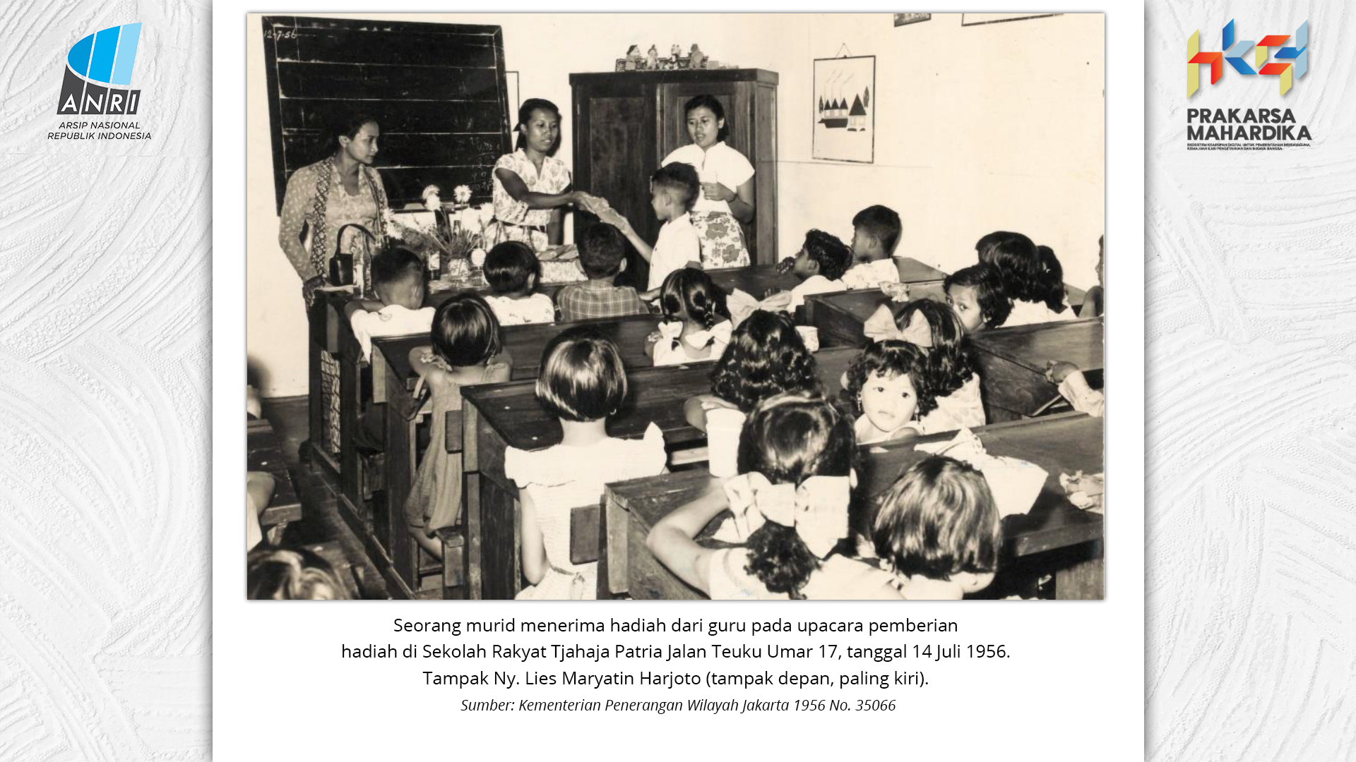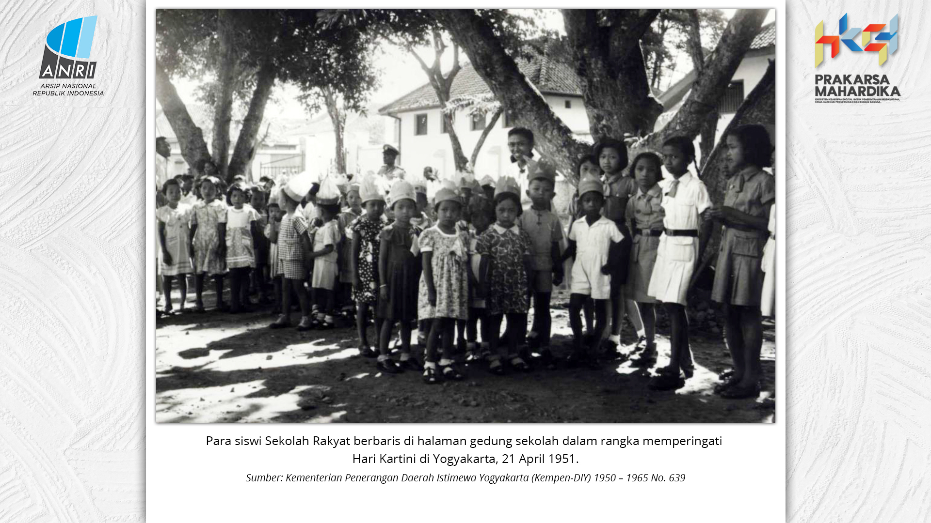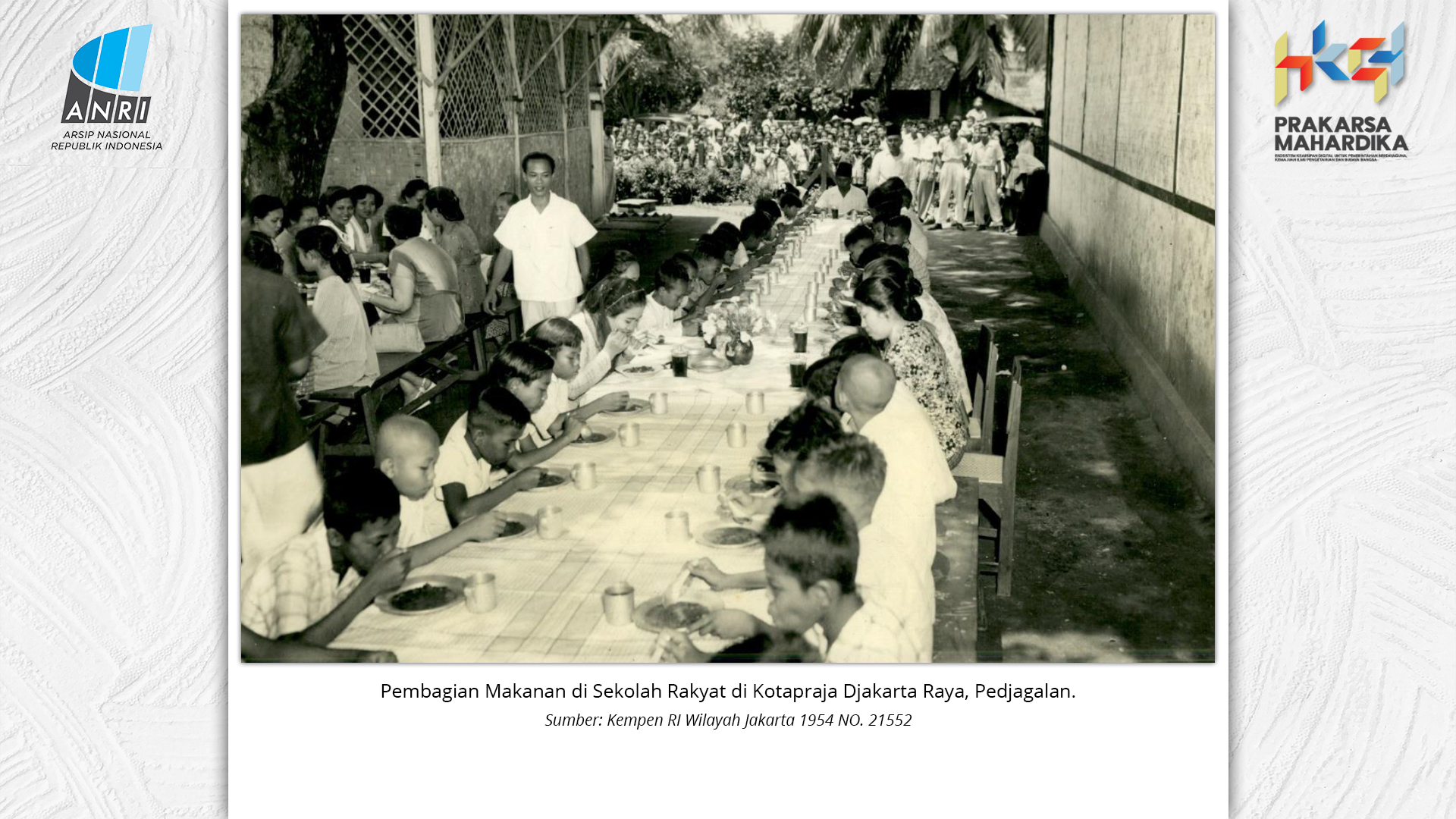 Perjalanan Sekolah Rakyat dimulai saat pemerintah Hindia Belanda membuka Sekolah Desa bagi anak-anak pribumi. Sekolah-sekolah ini tumbuh perlahan menjadi ruang yang menumbuhkan semangat belajar. Setelah kemerdekaan tahun 1945, Sekolah Rakyat bertransformasi menjadi bagian dari sistem pendidikan nasional. Meski nama dan sistemnya berubah, tetapi tetap mengemban peran penting dalam upaya mencerdaskan kehidupan bangsa. Namun, dalam perjuangan mencerdaskan bangsa, pemerintah dihadapkan dengan tingginya angka ketidakhadiran siswa akibat masalah gizi dan stunting. Dampaknya tidak hanya fisik, tetapi juga mengganggu kecerdasan dan produktivitas. Mereka lebih rentan sakit, mudah lelah, dan kesulitan berkonsentrasi, yang berujung pada ketidakhadiran bahkan putus sekolah. Stunting telah menjadi perhatian balk di tingkat nasional maupun global. Sejak masa kemerdekaan, Indonesia telah meluncurkan berbagai inisiatif untuk mengatasi masalah ini, serta peluncuran berbagai kebijakan strategis untuk menekan angka stunting di tanah air. Salah satunya melalui program Makan Bergizi Gratis. Pada masa Presiden Soeharto, perhatian ini ditegaskan kembali melalui Instruksi Presiden No. 1 Tahun 1997, yang meluncurkan Program Makanan Tambahan Anak Sekolah (PMS-AS) di daerah tertinggal sebagai bagian dari program besar Wajib Belajar Sembilan Tahun. Pada tahun 1984, Indonesia juga berhasil mencapai swasembada beras pada tahun 1984, bahkan mendapatkan pengakuan dari Food and Agriculture Organization (FAO). Semangat swasembada ini tetap menjadi landasan perjuangan menuju kedaulatan pangan, kesejahteraan bangsa, dan masa depan anak-anak Indonesia. Keempat program tersebut sejalan dengan visi Presiden Prabowo Subianto dan Wakil Presiden Gibran Rakabuming Raka dalam Kabinet Merah Putih yaitu "Bersama Maju Menuju Indonesia Emas 2045". Melalui arsip yang tersimpan di ANRI, dapat terlihat bagaimana keempat program tersebut menjadi perhatian dari masa ke masa. Pameran ini bukan sekedar menghadirkan potret masa lalu, tetapi juga menyuarakan harapan untuk membentuk wajah Indonesia yang sehat, cerdas, dan berdaya saing global sejalan dengan misi utama Asta Cita.