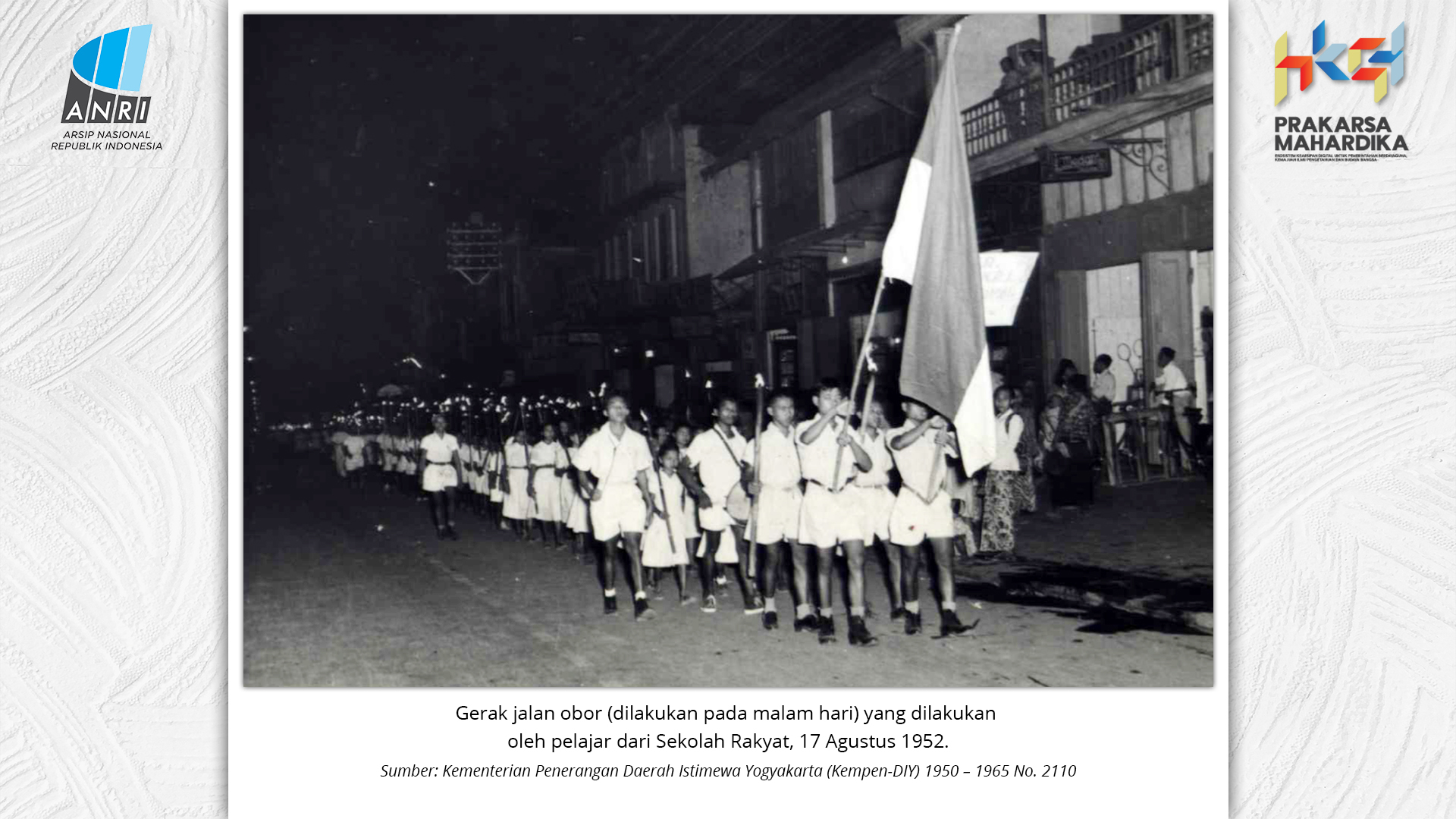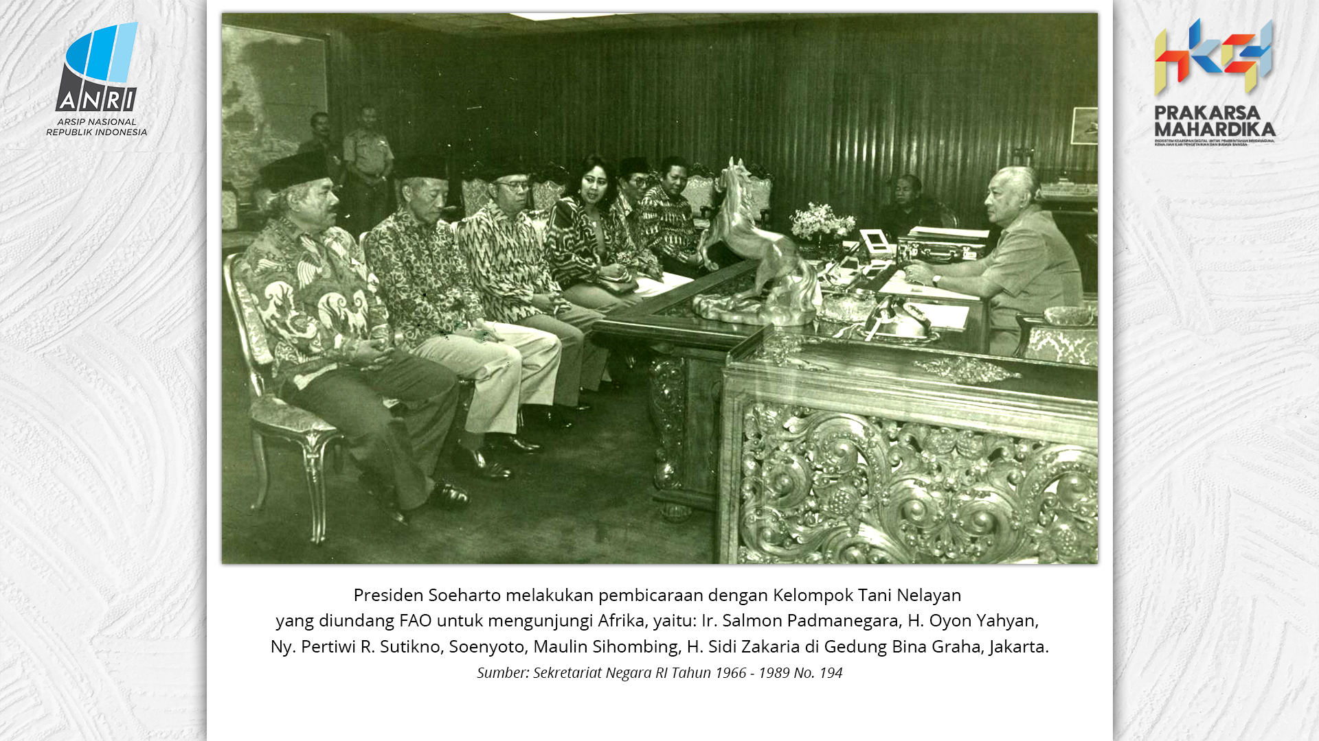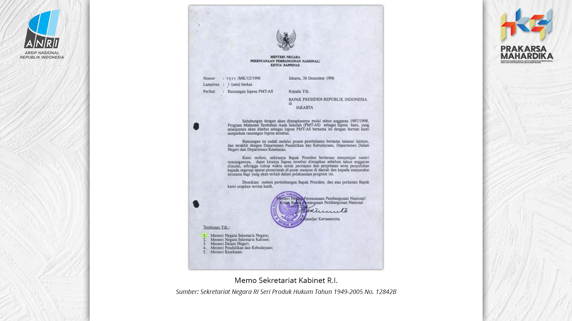 Perjalanan Sekolah Rakyat dimulai saat pemerintah Hindia Belanda membuka Sekolah Desa bagi anak-anak pribumi. Sekolah-sekolah ini tumbuh perlahan menjadi ruang yang menumbuhkan semangat belajar. Setelah kemerdekaan tahun 1945, Sekolah Rakyat bertransformasi menjadi bagian dari sistem pendidikan nasional. Meski nama dan sistemnya berubah, tetapi tetap mengemban peran penting dalam upaya mencerdaskan kehidupan bangsa. Namun, dalam perjuangan mencerdaskan bangsa, pemerintah dihadapkan dengan tingginya angka ketidakhadiran siswa akibat masalah gizi dan stunting. Dampaknya tidak hanya fisik, tetapi juga mengganggu kecerdasan dan produktivitas. Mereka lebih rentan sakit, mudah lelah, dan kesulitan berkonsentrasi, yang berujung pada ketidakhadiran bahkan putus sekolah. Stunting telah menjadi perhatian balk di tingkat nasional maupun global. Sejak masa kemerdekaan, Indonesia telah meluncurkan berbagai inisiatif untuk mengatasi masalah ini, serta peluncuran berbagai kebijakan strategis untuk menekan angka stunting di tanah air. Salah satunya melalui program Makan Bergizi Gratis. Pada masa Presiden Soeharto, perhatian ini ditegaskan kembali melalui Instruksi Presiden No. 1 Tahun 1997, yang meluncurkan Program Makanan Tambahan Anak Sekolah (PMS-AS) di daerah tertinggal sebagai bagian dari program besar Wajib Belajar Sembilan Tahun. Pada tahun 1984, Indonesia juga berhasil mencapai swasembada beras pada tahun 1984, bahkan mendapatkan pengakuan dari Food and Agriculture Organization (FAO). Semangat swasembada ini tetap menjadi landasan perjuangan menuju kedaulatan pangan, kesejahteraan bangsa, dan masa depan anak-anak Indonesia. Keempat program tersebut sejalan dengan visi Presiden Prabowo Subianto dan Wakil Presiden Gibran Rakabuming Raka dalam Kabinet Merah Putih yaitu "Bersama Maju Menuju Indonesia Emas 2045". Melalui arsip yang tersimpan di ANRI, dapat terlihat bagaimana keempat program tersebut menjadi perhatian dari masa ke masa. Pameran ini bukan sekedar menghadirkan potret masa lalu, tetapi juga menyuarakan harapan untuk membentuk wajah Indonesia yang sehat, cerdas, dan berdaya saing global sejalan dengan misi utama Asta Cita.