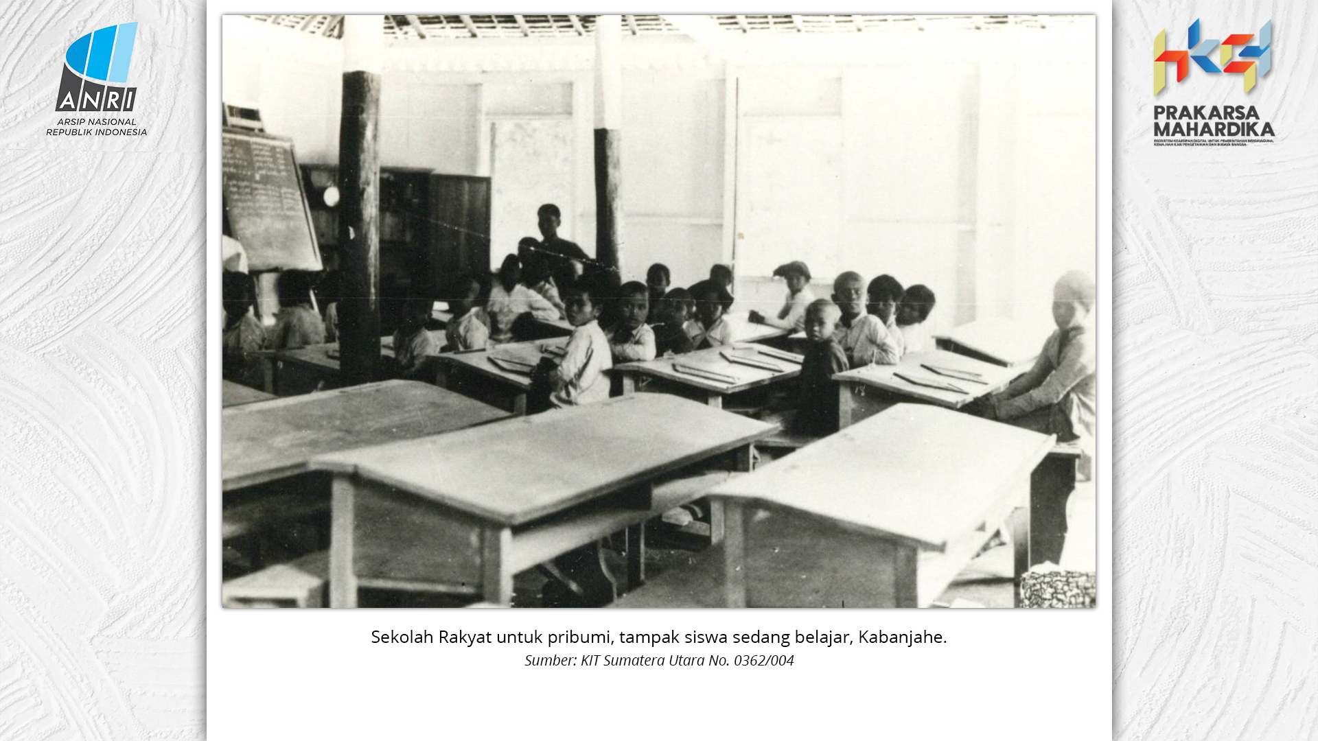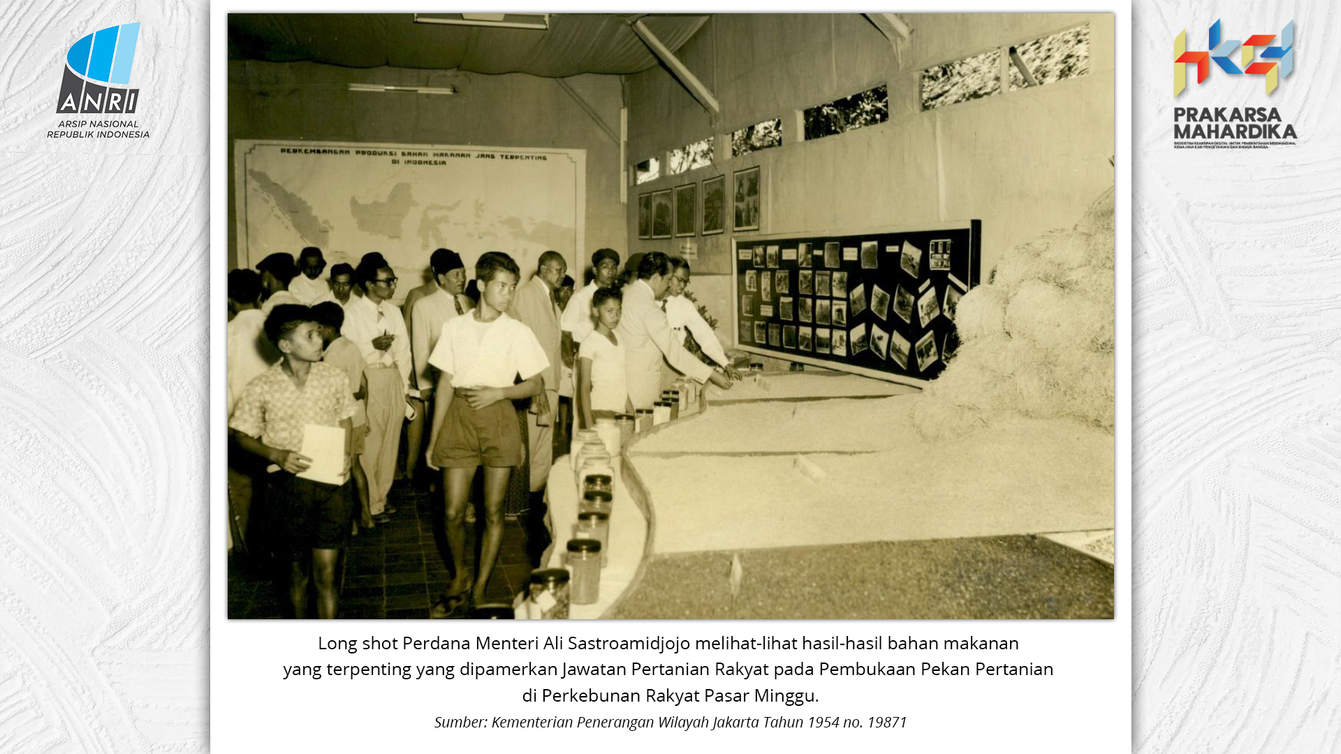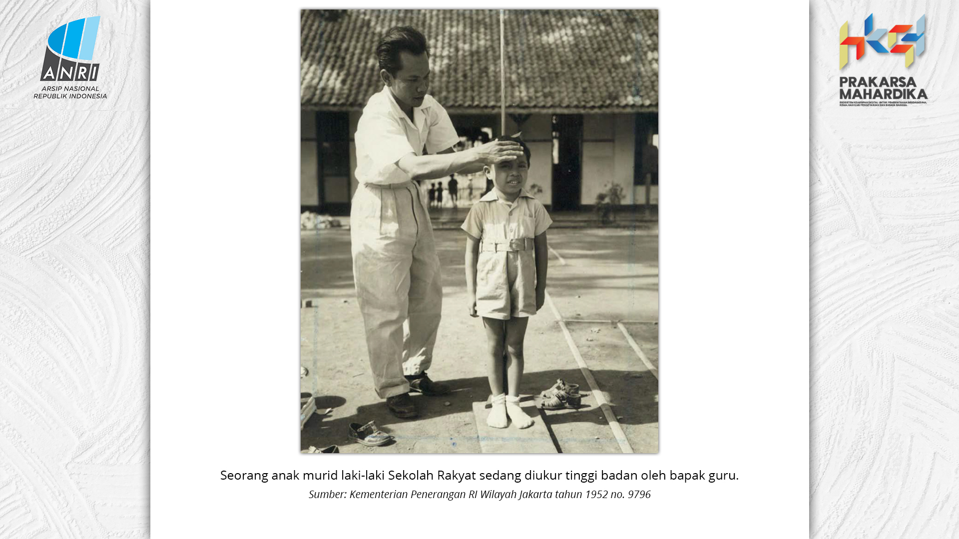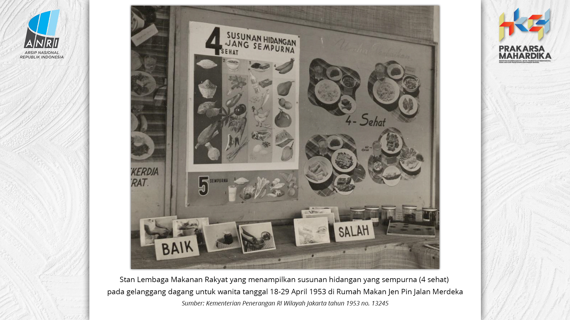 Perjalanan Sekolah Rakyat dimulai saat pemerintah Hindia Belanda membuka Sekolah Desa bagi anak-anak pribumi. Sekolah-sekolah ini tumbuh perlahan menjadi ruang yang menumbuhkan semangat belajar. Setelah kemerdekaan tahun 1945, Sekolah Rakyat bertransformasi menjadi bagian dari sistem pendidikan nasional. Meski nama dan sistemnya berubah, tetapi tetap mengemban peran penting dalam upaya mencerdaskan kehidupan bangsa. Namun, dalam perjuangan mencerdaskan bangsa, pemerintah dihadapkan dengan tingginya angka ketidakhadiran siswa akibat masalah gizi dan stunting. Dampaknya tidak hanya fisik, tetapi juga mengganggu kecerdasan dan produktivitas. Mereka lebih rentan sakit, mudah lelah, dan kesulitan berkonsentrasi, yang berujung pada ketidakhadiran bahkan putus sekolah. Stunting telah menjadi perhatian balk di tingkat nasional maupun global. Sejak masa kemerdekaan, Indonesia telah meluncurkan berbagai inisiatif untuk mengatasi masalah ini, serta peluncuran berbagai kebijakan strategis untuk menekan angka stunting di tanah air. Salah satunya melalui program Makan Bergizi Gratis. Pada masa Presiden Soeharto, perhatian ini ditegaskan kembali melalui Instruksi Presiden No. 1 Tahun 1997, yang meluncurkan Program Makanan Tambahan Anak Sekolah (PMS-AS) di daerah tertinggal sebagai bagian dari program besar Wajib Belajar Sembilan Tahun. Pada tahun 1984, Indonesia juga berhasil mencapai swasembada beras pada tahun 1984, bahkan mendapatkan pengakuan dari Food and Agriculture Organization (FAO). Semangat swasembada ini tetap menjadi landasan perjuangan menuju kedaulatan pangan, kesejahteraan bangsa, dan masa depan anak-anak Indonesia. Keempat program tersebut sejalan dengan visi Presiden Prabowo Subianto dan Wakil Presiden Gibran Rakabuming Raka dalam Kabinet Merah Putih yaitu "Bersama Maju Menuju Indonesia Emas 2045". Melalui arsip yang tersimpan di ANRI, dapat terlihat bagaimana keempat program tersebut menjadi perhatian dari masa ke masa. Pameran ini bukan sekedar menghadirkan potret masa lalu, tetapi juga menyuarakan harapan untuk membentuk wajah Indonesia yang sehat, cerdas, dan berdaya saing global sejalan dengan misi utama Asta Cita.