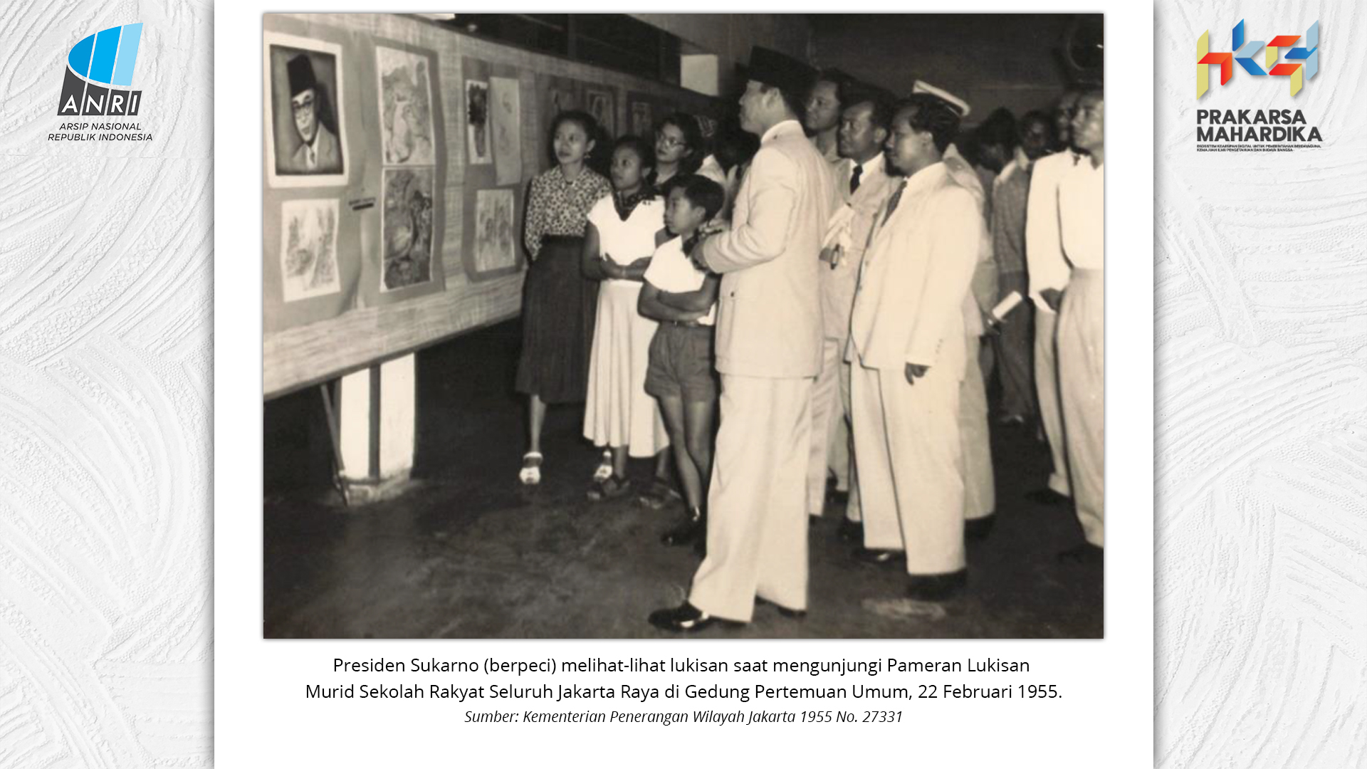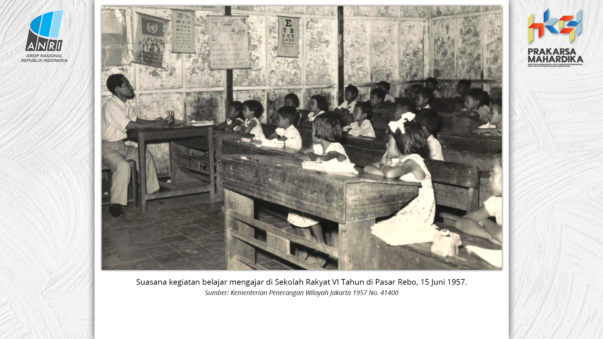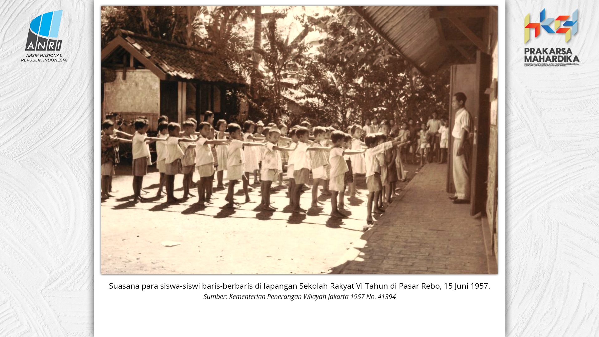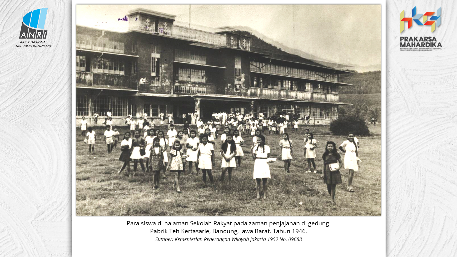 Perjalanan Sekolah Rakyat dimulai saat pemerintah Hindia Belanda membuka Sekolah Desa bagi anak-anak pribumi. Sekolah-sekolah ini tumbuh perlahan menjadi ruang yang menumbuhkan semangat belajar. Setelah kemerdekaan tahun 1945, Sekolah Rakyat bertransformasi menjadi bagian dari sistem pendidikan nasional. Meski nama dan sistemnya berubah, tetapi tetap mengemban peran penting dalam upaya mencerdaskan kehidupan bangsa. Namun, dalam perjuangan mencerdaskan bangsa, pemerintah dihadapkan dengan tingginya angka ketidakhadiran siswa akibat masalah gizi dan stunting. Dampaknya tidak hanya fisik, tetapi juga mengganggu kecerdasan dan produktivitas. Mereka lebih rentan sakit, mudah lelah, dan kesulitan berkonsentrasi, yang berujung pada ketidakhadiran bahkan putus sekolah. Stunting telah menjadi perhatian balk di tingkat nasional maupun global. Sejak masa kemerdekaan, Indonesia telah meluncurkan berbagai inisiatif untuk mengatasi masalah ini, serta peluncuran berbagai kebijakan strategis untuk menekan angka stunting di tanah air. Salah satunya melalui program Makan Bergizi Gratis. Pada masa Presiden Soeharto, perhatian ini ditegaskan kembali melalui Instruksi Presiden No. 1 Tahun 1997, yang meluncurkan Program Makanan Tambahan Anak Sekolah (PMS-AS) di daerah tertinggal sebagai bagian dari program besar Wajib Belajar Sembilan Tahun. Pada tahun 1984, Indonesia juga berhasil mencapai swasembada beras pada tahun 1984, bahkan mendapatkan pengakuan dari Food and Agriculture Organization (FAO). Semangat swasembada ini tetap menjadi landasan perjuangan menuju kedaulatan pangan, kesejahteraan bangsa, dan masa depan anak-anak Indonesia. Keempat program tersebut sejalan dengan visi Presiden Prabowo Subianto dan Wakil Presiden Gibran Rakabuming Raka dalam Kabinet Merah Putih yaitu "Bersama Maju Menuju Indonesia Emas 2045". Melalui arsip yang tersimpan di ANRI, dapat terlihat bagaimana keempat program tersebut menjadi perhatian dari masa ke masa. Pameran ini bukan sekedar menghadirkan potret masa lalu, tetapi juga menyuarakan harapan untuk membentuk wajah Indonesia yang sehat, cerdas, dan berdaya saing global sejalan dengan misi utama Asta Cita.