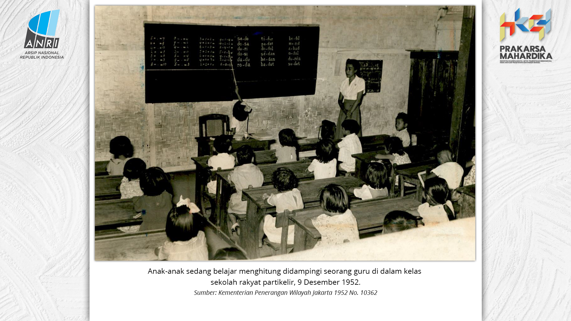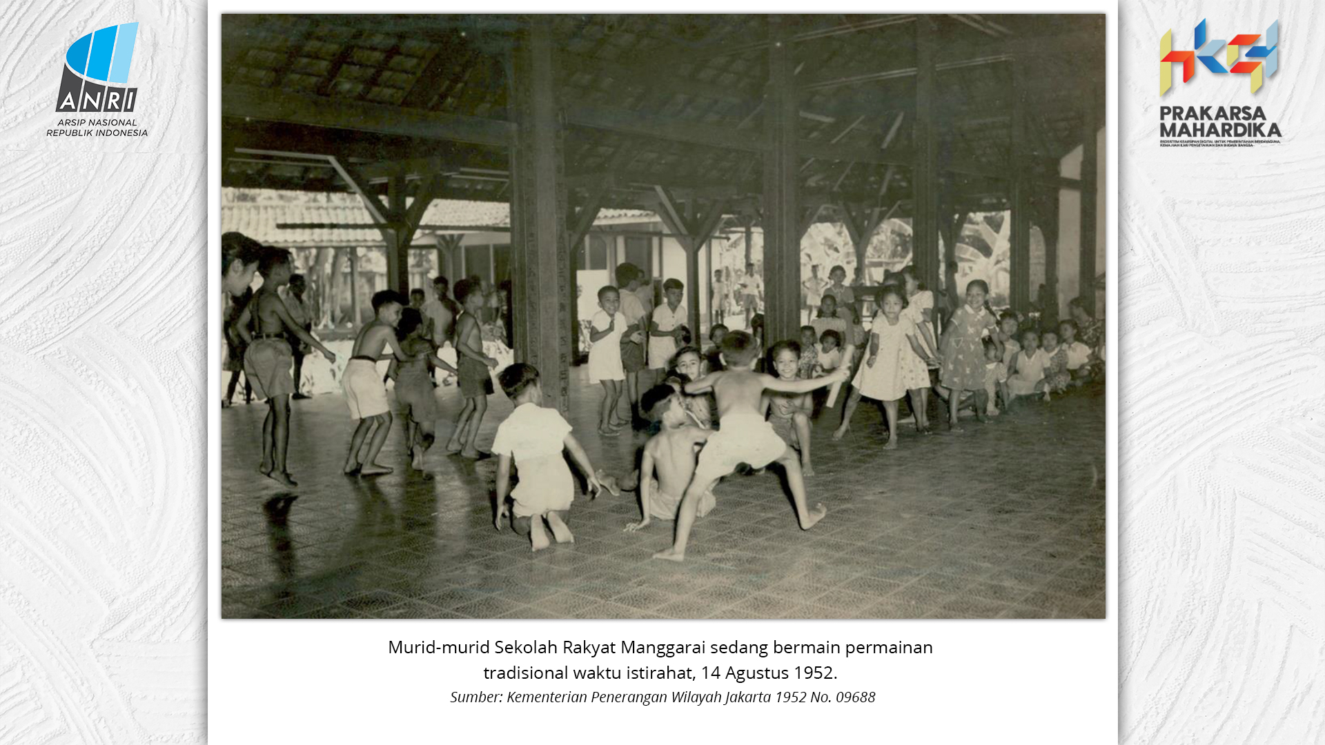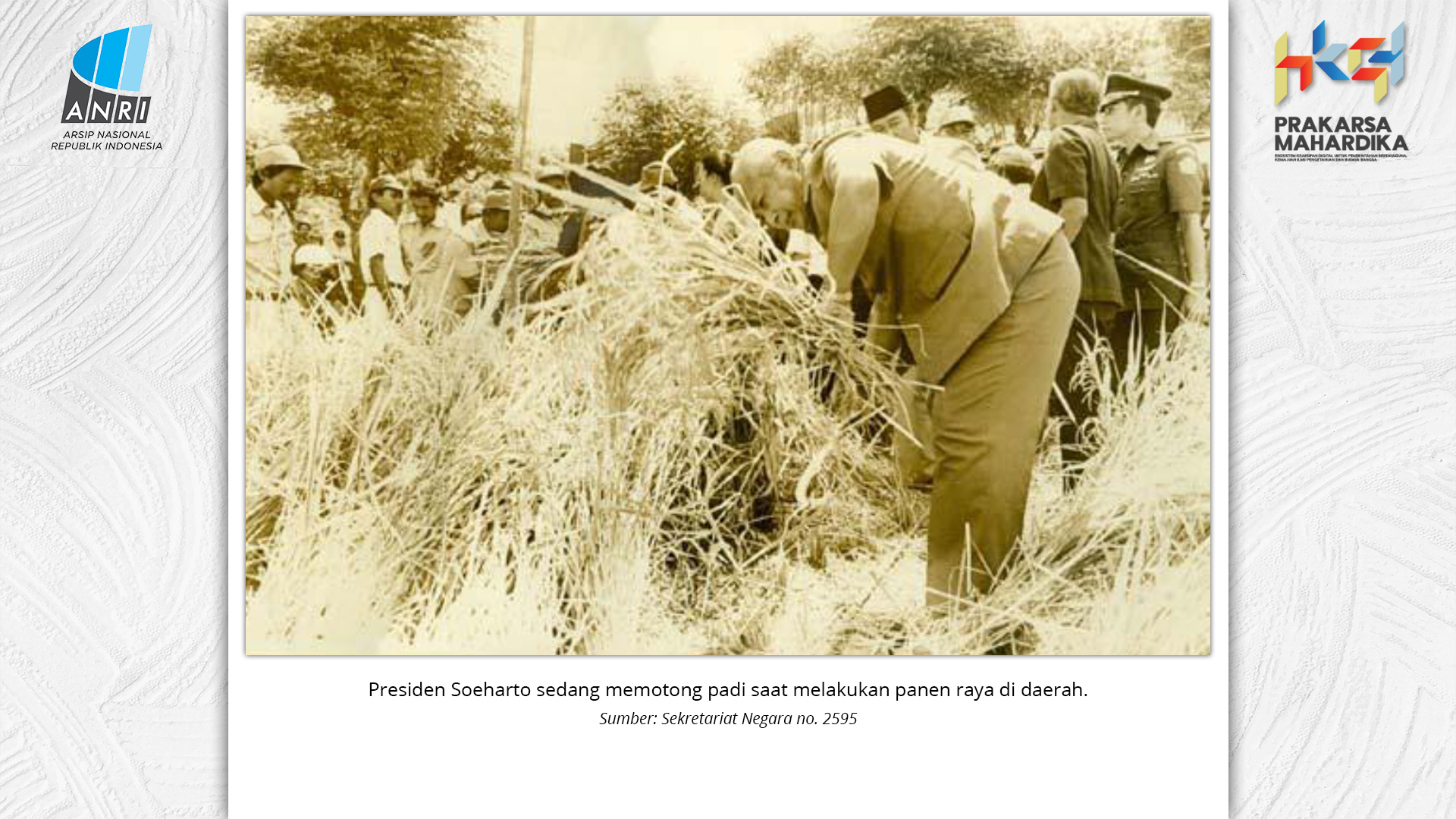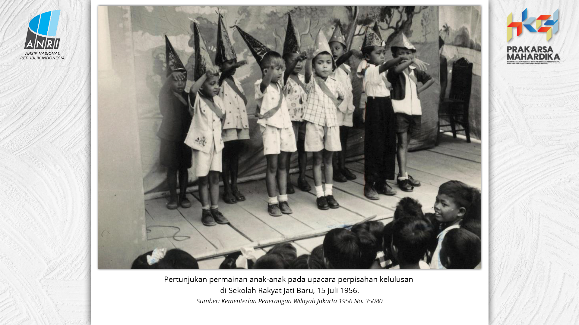 Perjalanan Sekolah Rakyat dimulai saat pemerintah Hindia Belanda membuka Sekolah Desa bagi anak-anak pribumi. Sekolah-sekolah ini tumbuh perlahan menjadi ruang yang menumbuhkan semangat belajar. Setelah kemerdekaan tahun 1945, Sekolah Rakyat bertransformasi menjadi bagian dari sistem pendidikan nasional. Meski nama dan sistemnya berubah, tetapi tetap mengemban peran penting dalam upaya mencerdaskan kehidupan bangsa. Namun, dalam perjuangan mencerdaskan bangsa, pemerintah dihadapkan dengan tingginya angka ketidakhadiran siswa akibat masalah gizi dan stunting. Dampaknya tidak hanya fisik, tetapi juga mengganggu kecerdasan dan produktivitas. Mereka lebih rentan sakit, mudah lelah, dan kesulitan berkonsentrasi, yang berujung pada ketidakhadiran bahkan putus sekolah. Stunting telah menjadi perhatian balk di tingkat nasional maupun global. Sejak masa kemerdekaan, Indonesia telah meluncurkan berbagai inisiatif untuk mengatasi masalah ini, serta peluncuran berbagai kebijakan strategis untuk menekan angka stunting di tanah air. Salah satunya melalui program Makan Bergizi Gratis. Pada masa Presiden Soeharto, perhatian ini ditegaskan kembali melalui Instruksi Presiden No. 1 Tahun 1997, yang meluncurkan Program Makanan Tambahan Anak Sekolah (PMS-AS) di daerah tertinggal sebagai bagian dari program besar Wajib Belajar Sembilan Tahun. Pada tahun 1984, Indonesia juga berhasil mencapai swasembada beras pada tahun 1984, bahkan mendapatkan pengakuan dari Food and Agriculture Organization (FAO). Semangat swasembada ini tetap menjadi landasan perjuangan menuju kedaulatan pangan, kesejahteraan bangsa, dan masa depan anak-anak Indonesia. Keempat program tersebut sejalan dengan visi Presiden Prabowo Subianto dan Wakil Presiden Gibran Rakabuming Raka dalam Kabinet Merah Putih yaitu "Bersama Maju Menuju Indonesia Emas 2045". Melalui arsip yang tersimpan di ANRI, dapat terlihat bagaimana keempat program tersebut menjadi perhatian dari masa ke masa. Pameran ini bukan sekedar menghadirkan potret masa lalu, tetapi juga menyuarakan harapan untuk membentuk wajah Indonesia yang sehat, cerdas, dan berdaya saing global sejalan dengan misi utama Asta Cita.